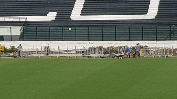 Obras para colocar o banco de reservas na lateral seguem sendo feitas aqui em São Januário. Não estreia no jogo do Vasco desta quinta-feira #lanceVAS