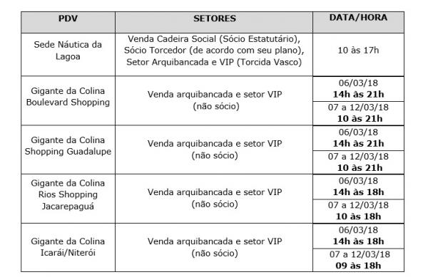 Atendendo aos pedidos dos torcedores, o Vasco da Gama abrirá pontos de venda do Combo Libertadores nas Lojas Gigantes da Colina e Sede Náutica da Lagoa.