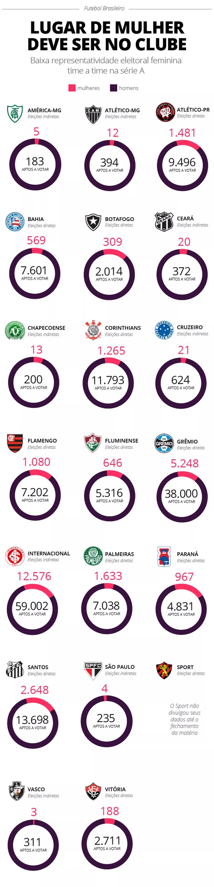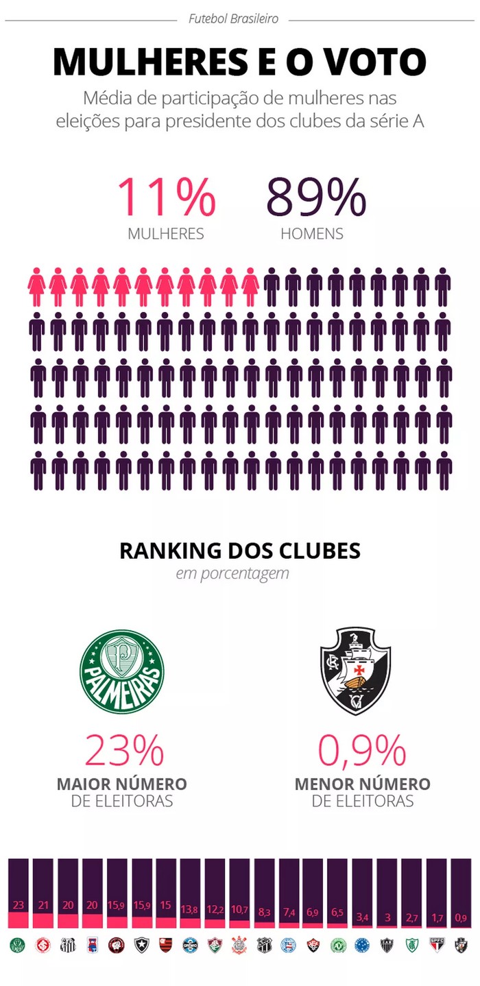 Um levantamento feito pelo GloboEsporte.com no último mês analisou o percentual de mulheres dentro do grupo de eleitores que escolhem os presidentes de clubes da primeira divisão. As mulheres representam apenas 11% do universo de pessoas aptas a votar em 19 clubes da Série A**. Do outro lado, o Palmeiras é o clube com a maior participação, com 23%.
