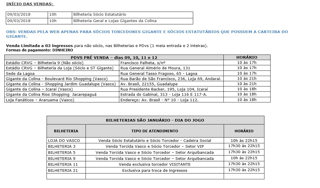 1. SÓCIO TORCEDOR GIGANTE – a venda de ingressos para os sócios-torcedores será feita exclusivamente pela FutebolCard ATRAVÉS DO SITE DO GIGANTE E NA BILHETERIA AO LADO DA MEGALOJA DE SÃO JANUÁRIO.