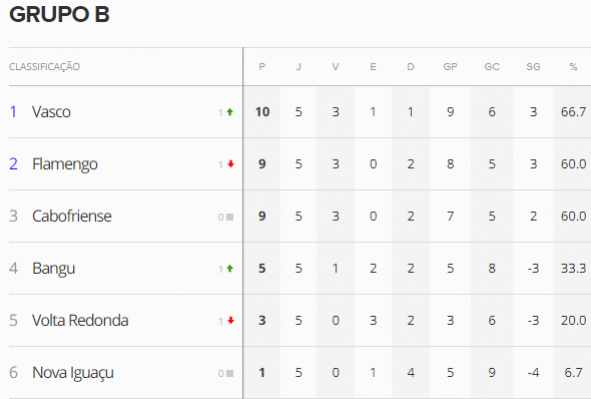 Na classificação geral das fases de grupos das Taças Guanabara e Rio, o Vasco subiu da 6ª para a 4ª colocação.