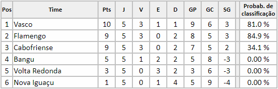 De acordo com o site Chance de Gol, especializado em probabilidades relacionadas a campeonatos de futebol, o Vasco tem 81% de chance de se classificar à semifinal da Taça Rio. O Gigante da Colina enfrenta o Botafogo no domingo, às 16h, no Engenhão, e precisa vencer para avançar sem depender de nenhum outro resultado.