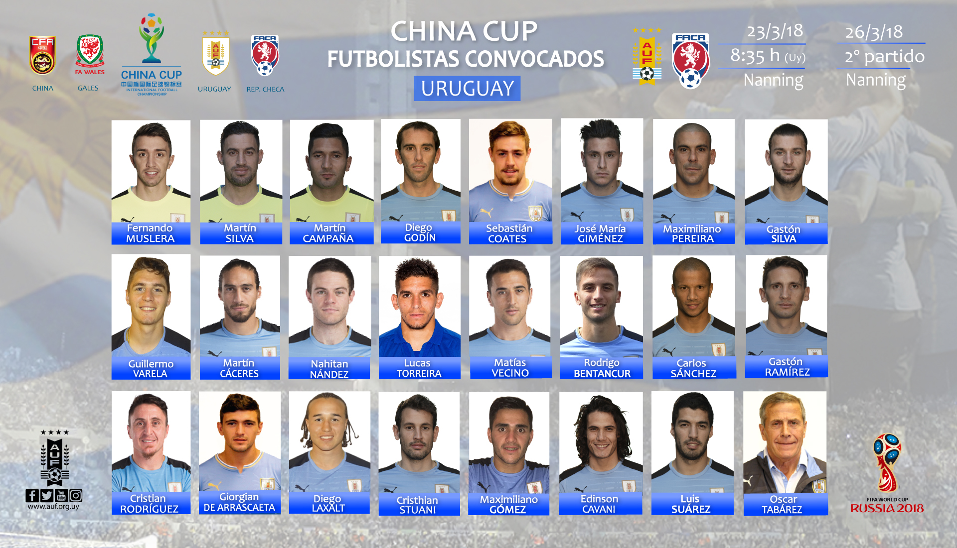 Oscar Tabárez confirmó a 23 futbolistas para la disputa de la China Cup, cuadrangular amistoso a disputarse en Nanning, China, entre el 23 y el 26 de marzo. La lista se compone de 21 futbolistas que juegan en el exterior y dos del medio local: Cristian Rodríguez y Guillermo Varela.