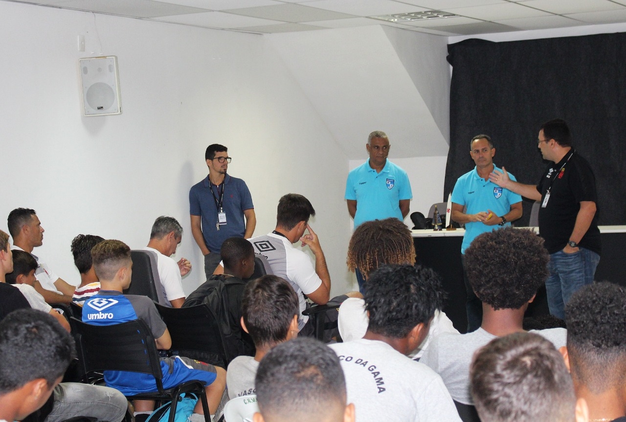 A preparação das categorias sub-15 e sub-17 do Vasco da Gama para o Campeonato Carioca também se estende para fora do gramado. Parte deste processo aconteceu neste sábado (17/03), com a realização de uma palestra sobre arbitragem, em parceria com a FERJ. No Salão de Beneméritos de São Januário, os profissionais Sergio Oliveira Santos, secretário da Comissão de Arbitragem e coordenador da Comissão de Ensino, e Claudio José de Oliveiras Soares, instrutor da COAF/RJ, conversaram com os atletas cruzmaltinos e exaltaram a iniciativa do Gigante da Colina.