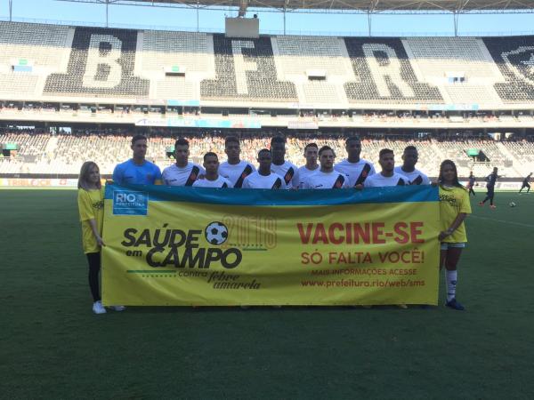 Time do Vasco posa para foto com faixa sobre a febre amarela