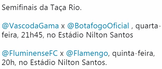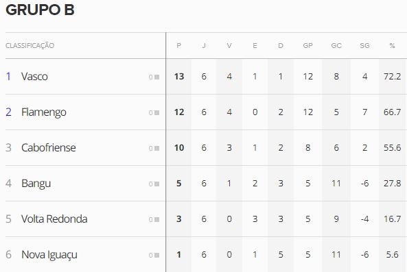 Finalizada a 6ª e última rodada da 1ª fase da Taça Rio, o Vasco, que derrotou o Botafogo por 3 a 2, terminou a fase na liderança do Grupo B e se classificou para a semifinal da Taça Rio, na qual enfrentará, com a vantagem do empate, o Botafogo. A outra semi será Fluminense x Flamengo.