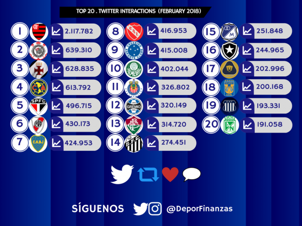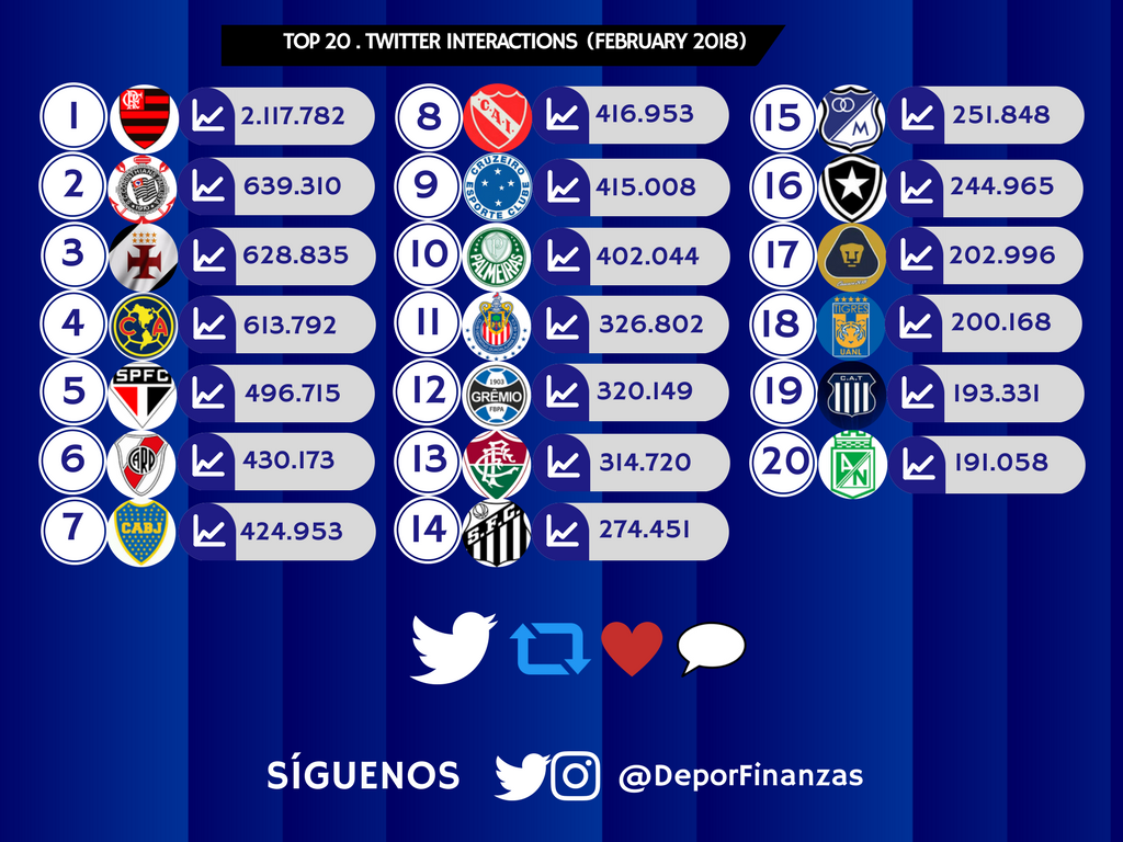 💻⚽ @VascodaGama foi o terceiro clube da América com mais interações (628K) no #twitter durante fevereiro de 2018.