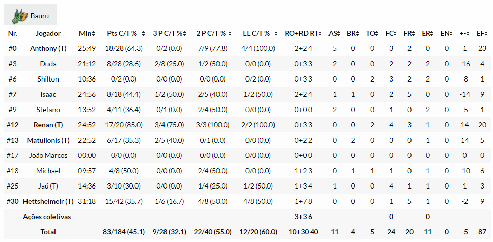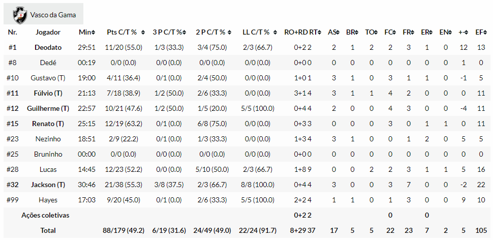 Com 21 pontos, David Jackson foi o cestinha da partida. O Vasco ainda teve Lucas Mariano com 12 pontos e mais nove rebotes, quase um duplo-duplo. Pelo lado bauruense, Anthony foi o melhor pontuador, com 18, seguido de Hettsheimeir, que anotou 15 pontos.