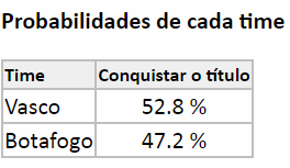 De acordo com o site Chance de Gol, especializado em previsões relacionadas a futebol, o Vasco tem 52,8% de chance de se sagrar campeão estadual contra 47,8% do Botafogo.