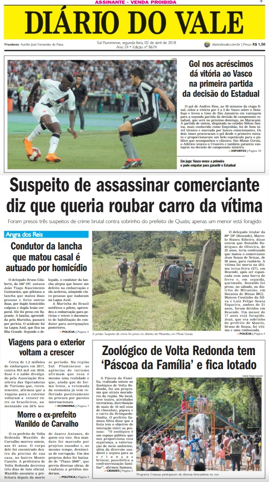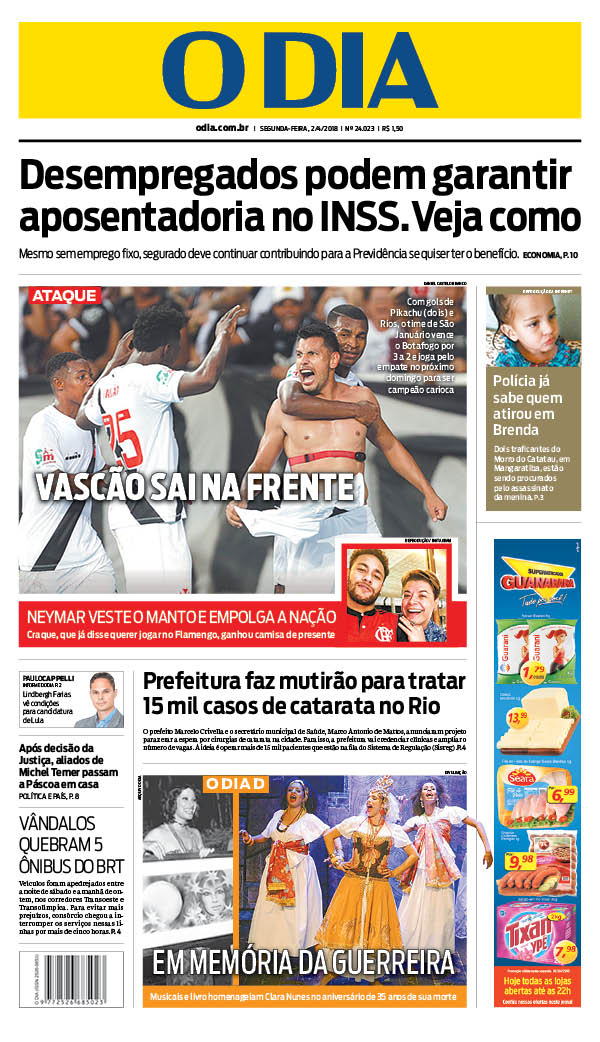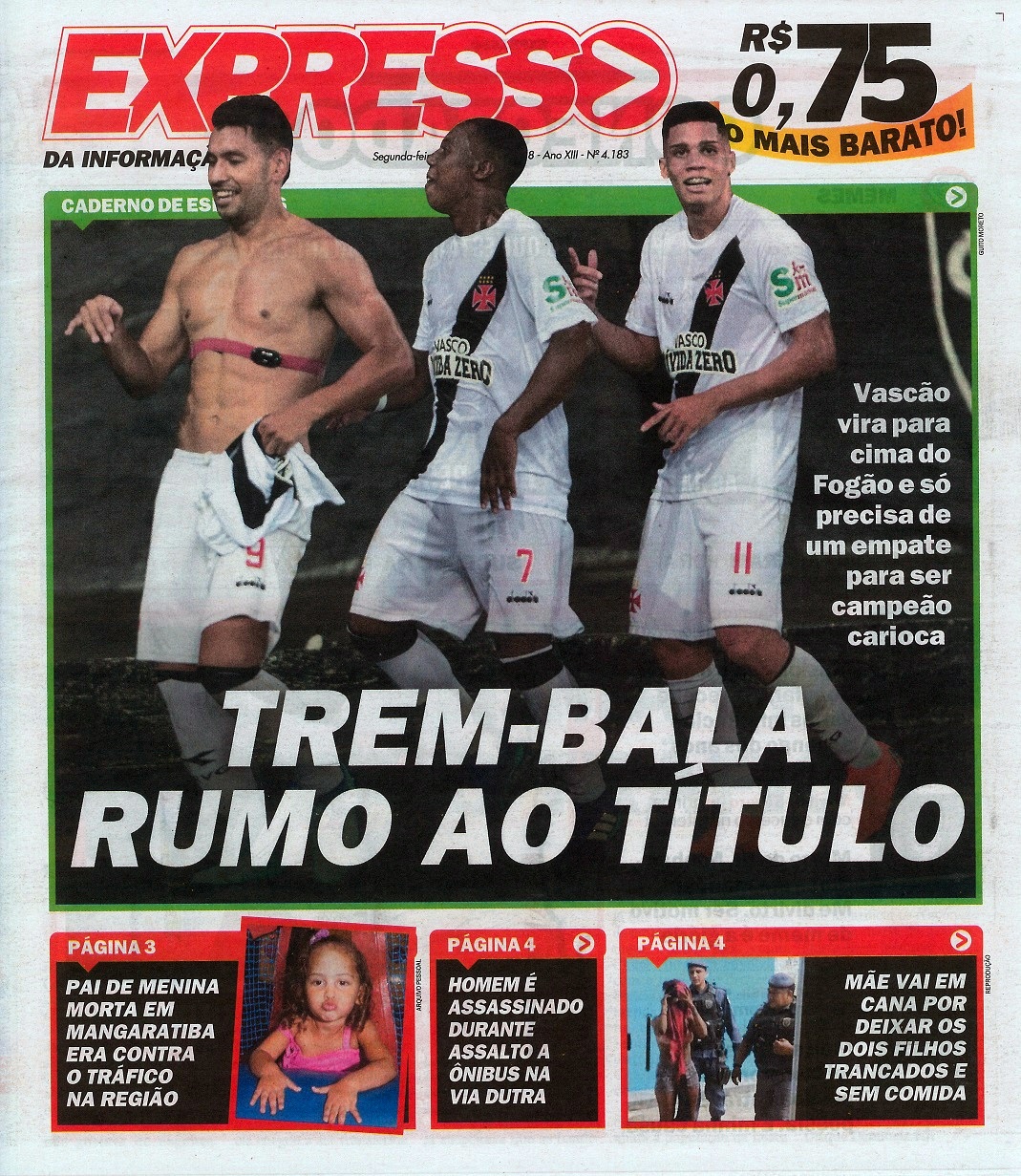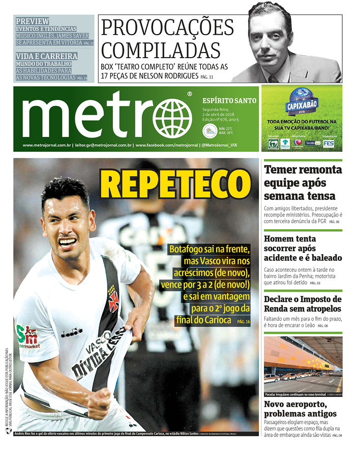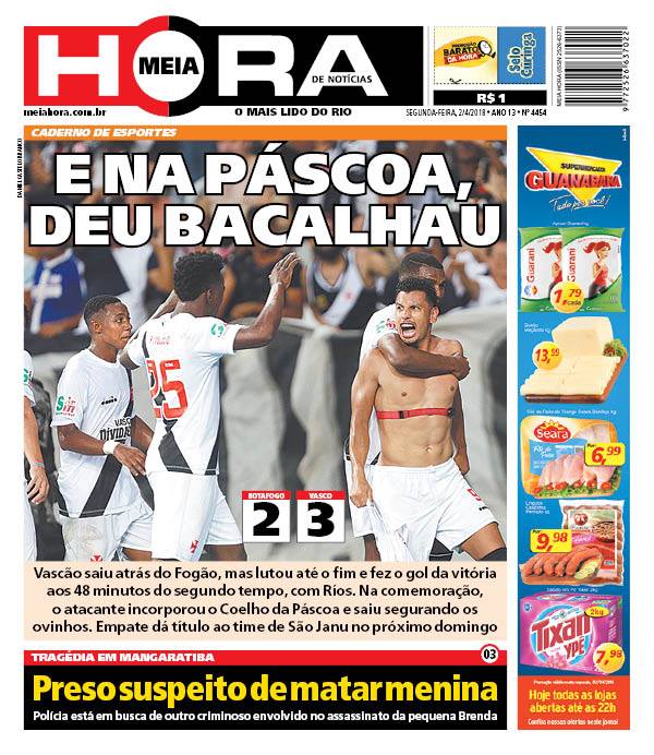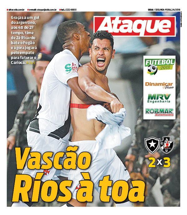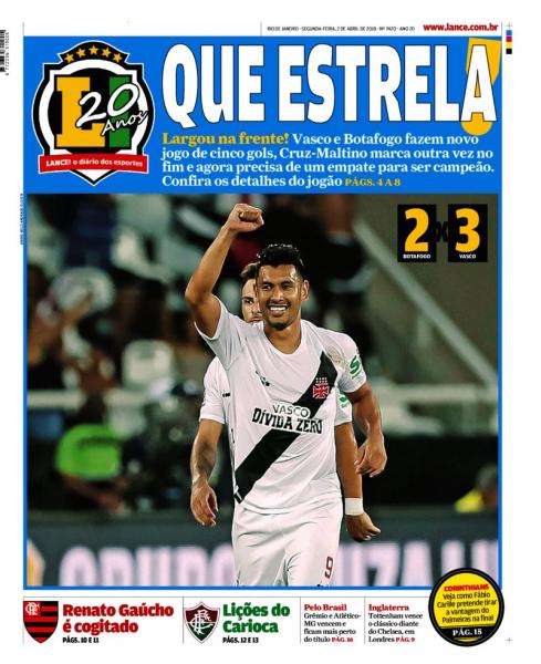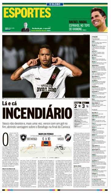 No 1º jogo da final do Campeonato Estadual, o Vasco derrotou o Botafogo por 3 a 2 na tarde de domingo no Engenhão e ficou a um empate do título. No 1º tempo, Renatinho abriu o placar para o Botafogo aos 3 minutos; Yago Pikachu virou para o Vasco aos 28 e 30 minutos; Brenner, de cabeça, empatou para o Botafogo aos 43. No 2º tempo, Andrés Ríos fez o gol da vitória aos 48 minutos.