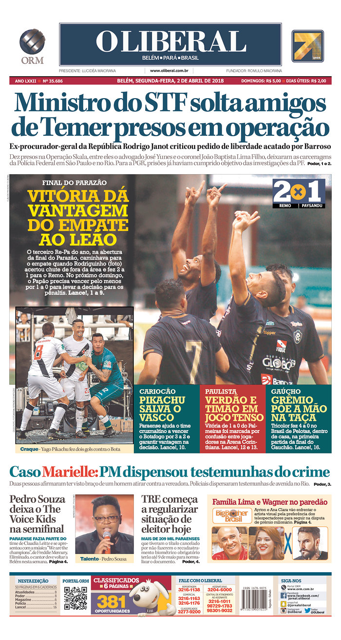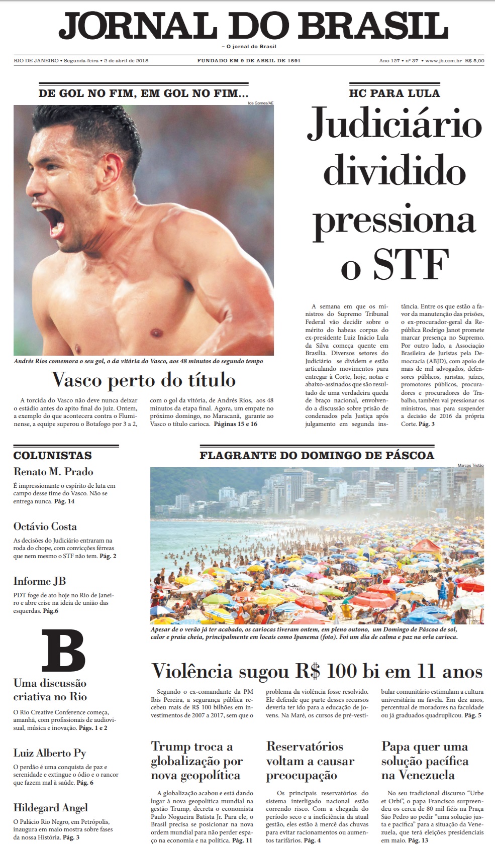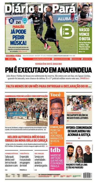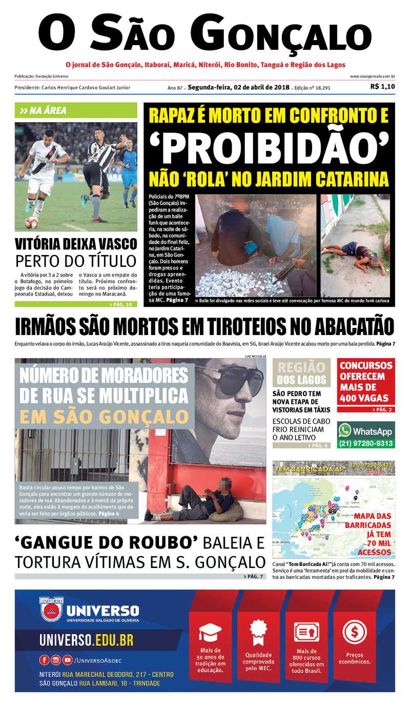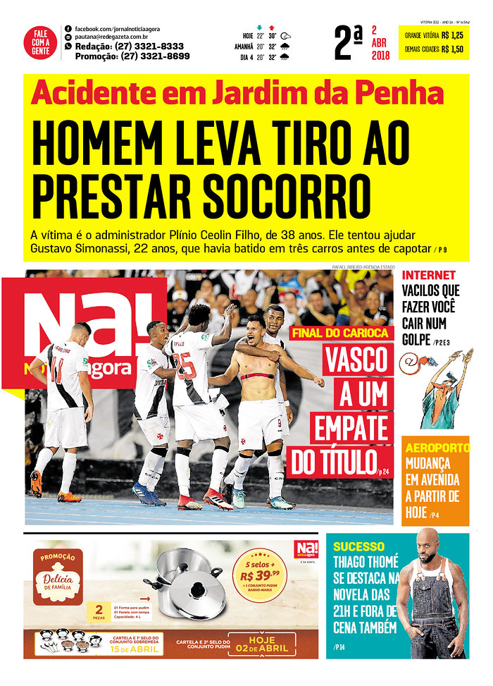 No 1º jogo da final do Campeonato Estadual, o Vasco derrotou o Botafogo por 3 a 2 na tarde de domingo no Engenhão e ficou a um empate do título. No 1º tempo, Renatinho abriu o placar para o Botafogo aos 3 minutos; Yago Pikachu virou para o Vasco aos 28 e 30 minutos; Brenner, de cabeça, empatou para o Botafogo aos 43. No 2º tempo, Andrés Ríos fez o gol da vitória aos 48 minutos.