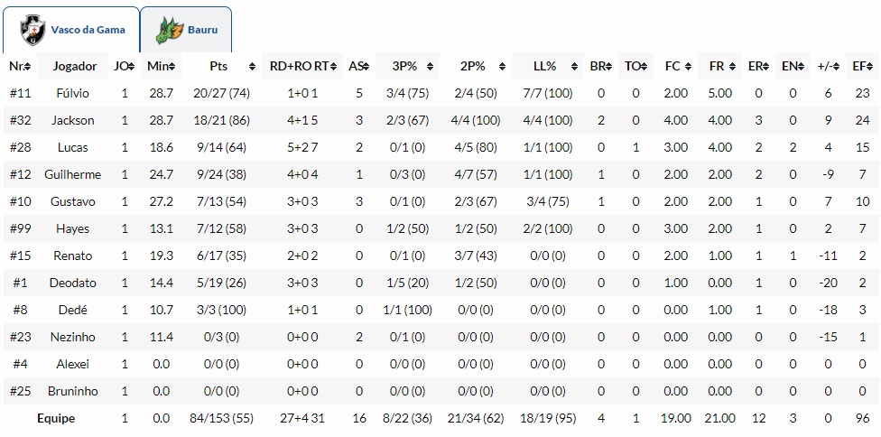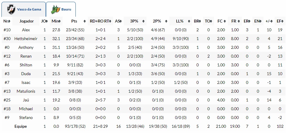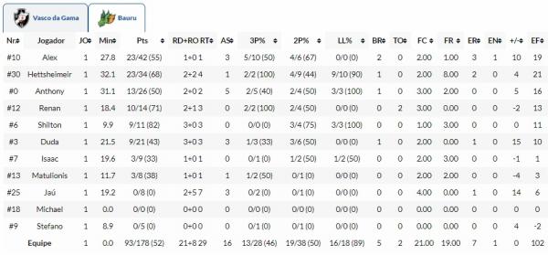 Além de Alex, Rafael Hettsheimer foi outro que teve excelente atuação pelo Bauru: foram outros 23 pontos para o ala-pivô. Pelo lado do Vasco, os destaques foram Fúlvio e David Jackson, com 20 e 18 pontos, respectivamente.