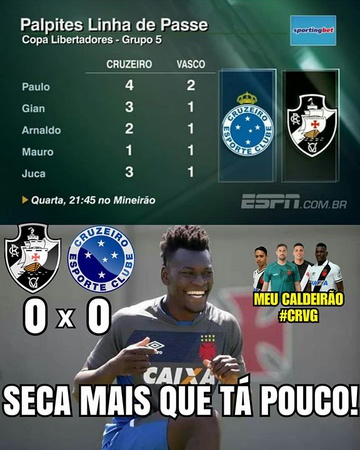 Pela fase de grupos da Libertadores, o Vasco empatou com o Cruzeiro por 0 a 0 na noite da última 4ª-feira no Mineirão, em Belo Horizonte, em jogo marcado por uma contusão do atacante vascaíno Paulinho no cotovelo.