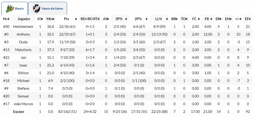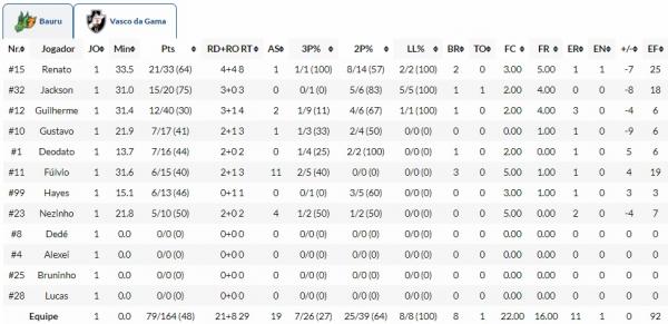 Com 22 pontos, Hettsheimeir e Anthony foram os cestinhas da partida, anotando mais de metade dos pontos do Bauru. Pelo Vasco, Renato Carbonari fez 21 pontos e ainda apanhou oito rebotes na partida.