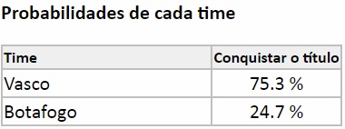 De acordo com o site Chance de Gol, especializado em previsões relacionadas a futebol, o Vasco tem 75,3% de chance de se sagrar campeão estadual contra 24,7% do Botafogo.