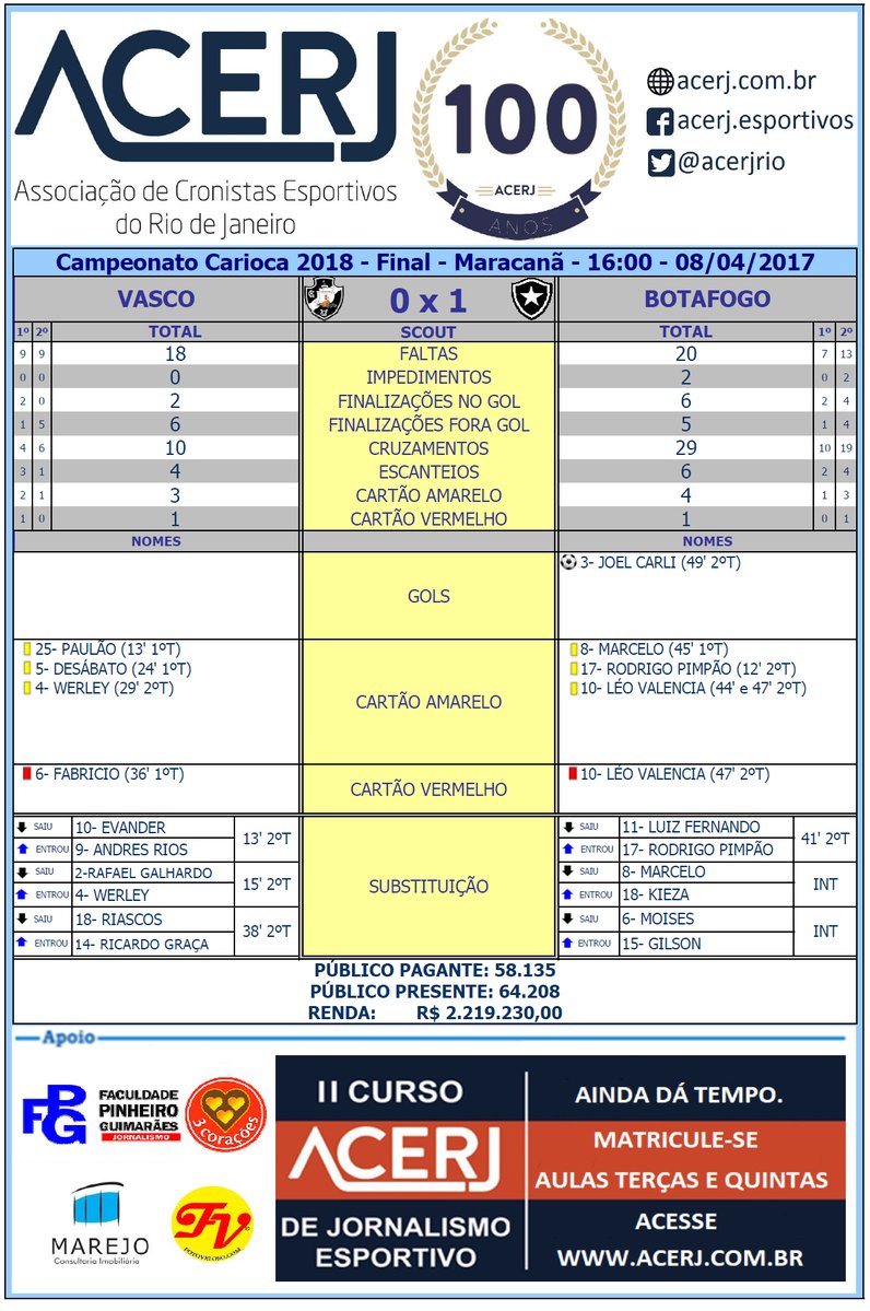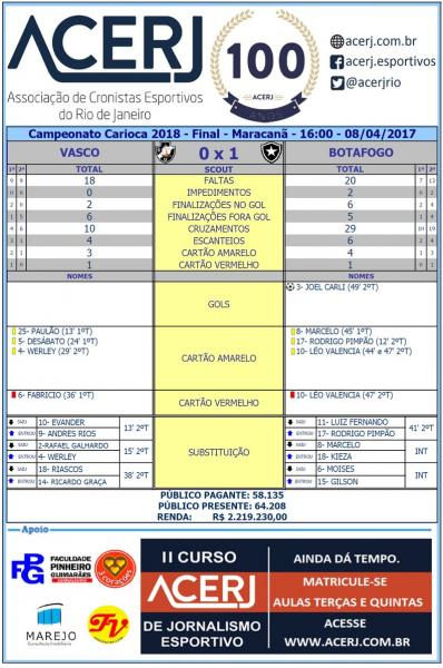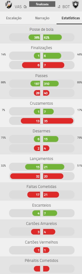 Confira estatísticas de Vasco 0 x 1 Botafogo