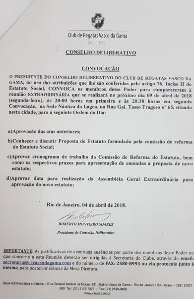 O Conselho Deliberativo do Vasco se reúne nesta 2ª-feira às 20h na sede da Lagoa. Na pauta, a reforma do estatuto do clube.