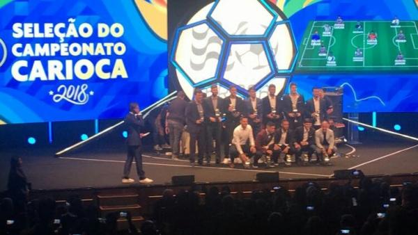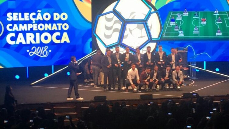 O momento em que os jogadores da seleção do Carioca posam todos juntos. Cada um deles levou um cheque no valor de R$ 10 mil.