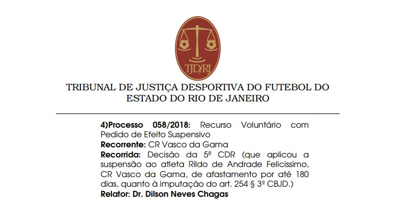 O recurso do @VascodaGama em relação à pena aplicada a Rildo (retorno aos gramados só após a recuperação de João Paulo ou prazo máximo de 180 dias) será julgado às 18h (de Brasília), nesta quinta-feira (12).