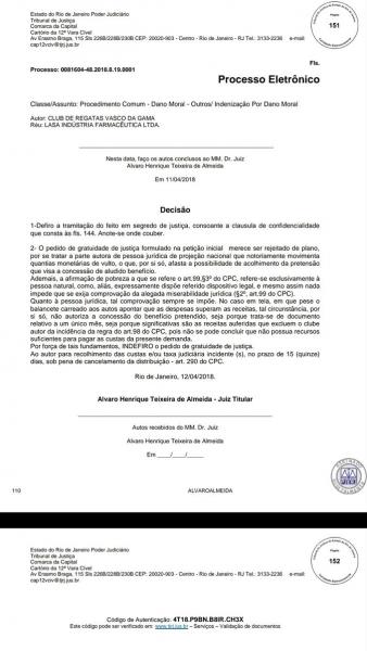 O Vasco entrou na última segunda-feira com processo na Justiça contra a Lasa na busca da indenização pelo não cumprimento do contrato de patrocínio. Primeiro pedido do clube foi para ter assistência judiciária gratuita, o que foi negado há pouco pelo juiz Álvaro Almeida #lanceVAS
