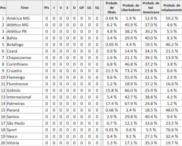 O site Chance de Gol, especializado em previsões estatísticas relacionadas a futebol, cravou em 0,4% a probabilidade do Vasco vencer o Brasileiro 2018. Em relação à classificação à Libertadores, a chance é de 9,1%. Já no que diz respeito ao rebaixamento, a estimativa é de 32,4%.