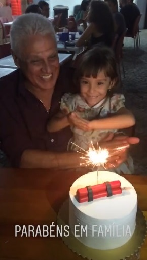 Roberto Dinamite comemorou seus 64 anos em família. Na foto abaixo, o ídolo vascaíno, com a neta no colo, observa seu bolo de aniversário, que tem uma vela em formato de bananas de dinamite.