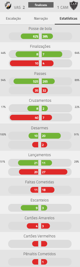 Confira estatísticas de Vasco 2 x 1 Atlético-MG