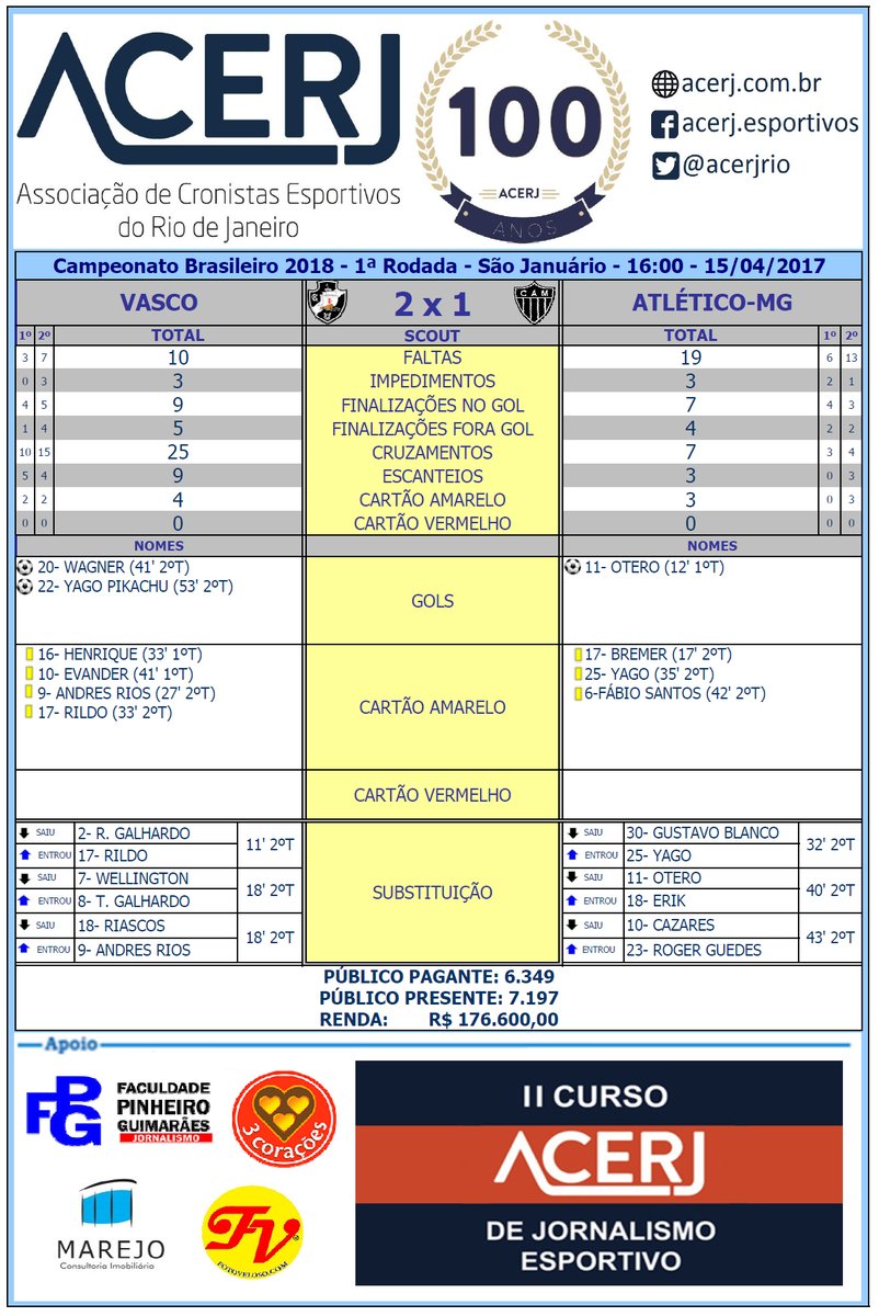15/04/18 - São Januário recebeu 6.349 torcedores para Vasco x Atlético-MG, sendo 7.197 pagantes