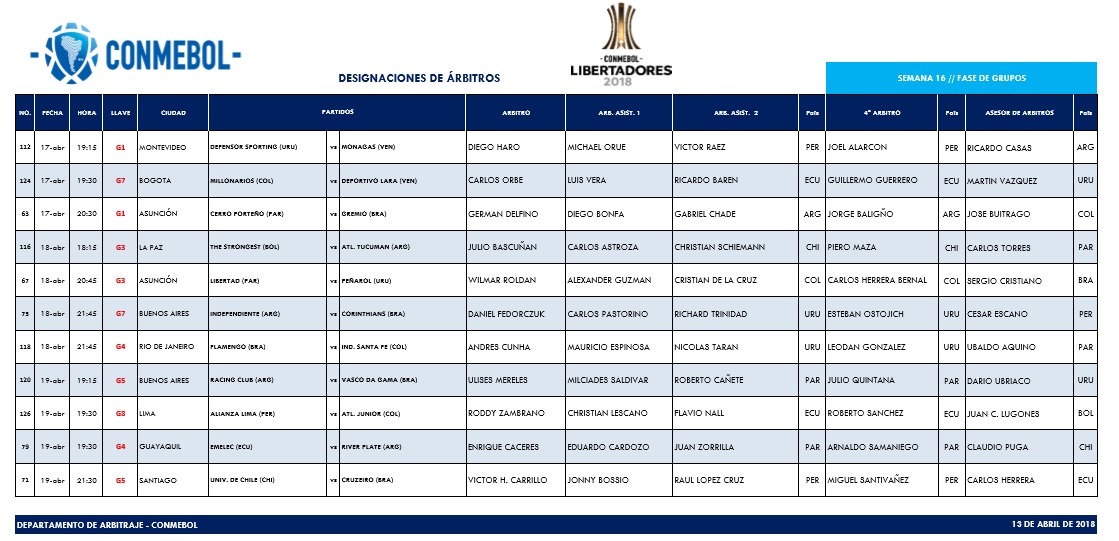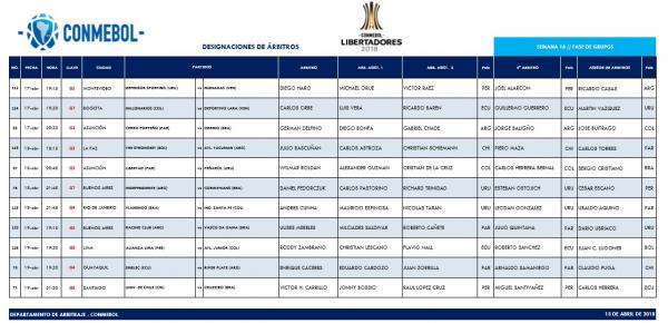 El Departamento de Arbitraje de la CONMEBOL designó este sábado a los árbitros para los juegos correspondientes a la Fase de Grupos de la CONMEBOL Libertadores 2018.