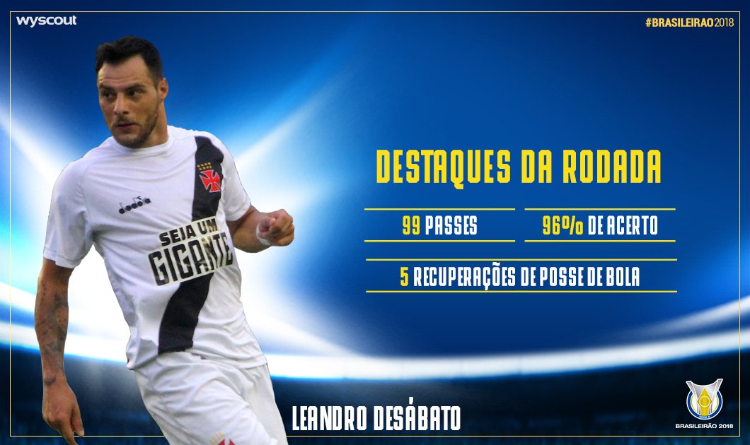 #DestaquesdaRodada: Leandro Desábato, do @VascodaGama, foi o jogador com mais passes na rodada e teve um aproveitamento impressionante (96%)! #Brasileirão2018