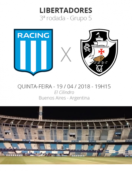 O Vasco volta a campo pela Libertadores nesta quinta-feira, às 19h15 (de Brasília), para enfrentar o Racing. A partida será no estádio Presidente Perón, conhecido como "El Cilindro", em Avellaneda. Com apenas um ponto somado em duas rodadas, a equipe cruz-maltina tem como missão conseguir ao menos um empate. Os argentinos lideram o Grupo 5 com quatro pontos.