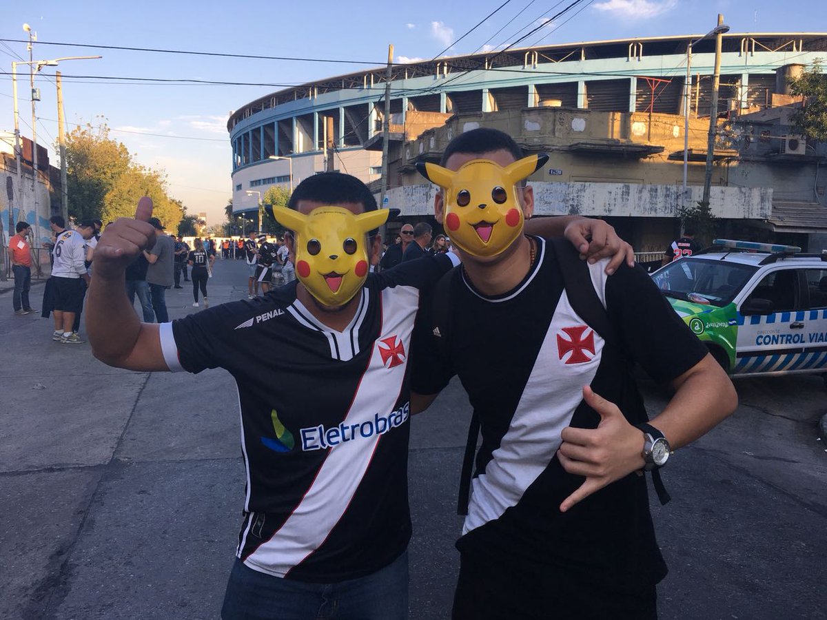 Torcedores vascaínos tiram foto com máscara de Pikachu do lado de fora do El Cilindro