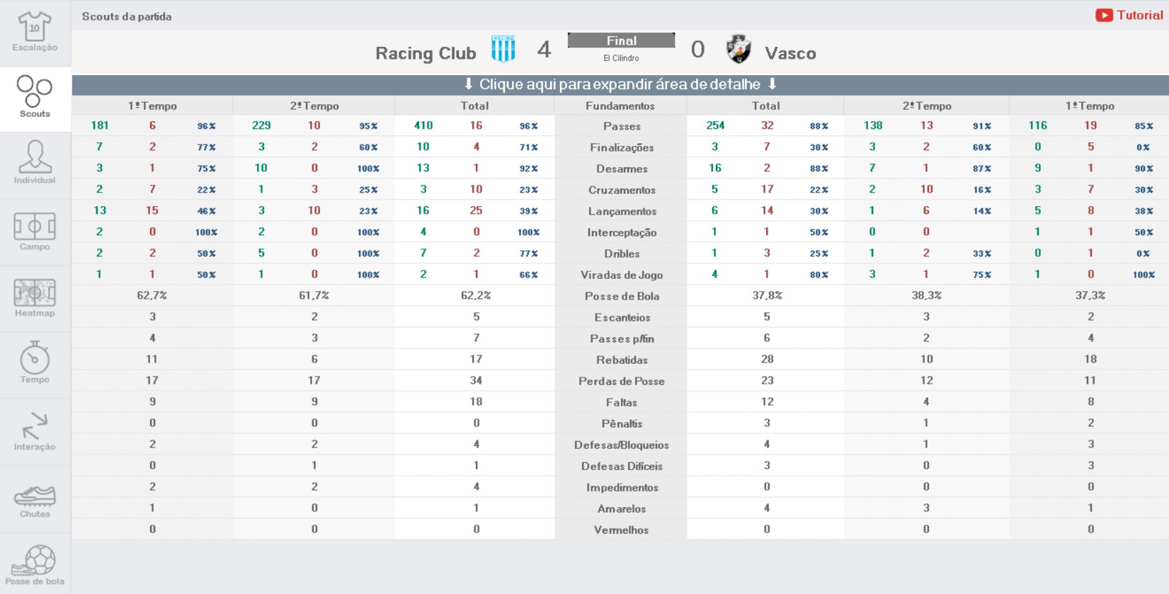 Confira estatísticas de Racing 4 x 0 Vasco