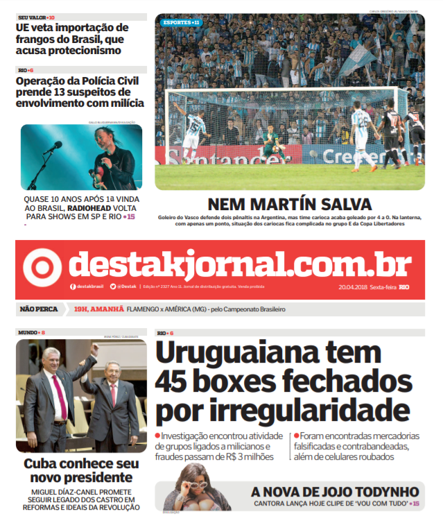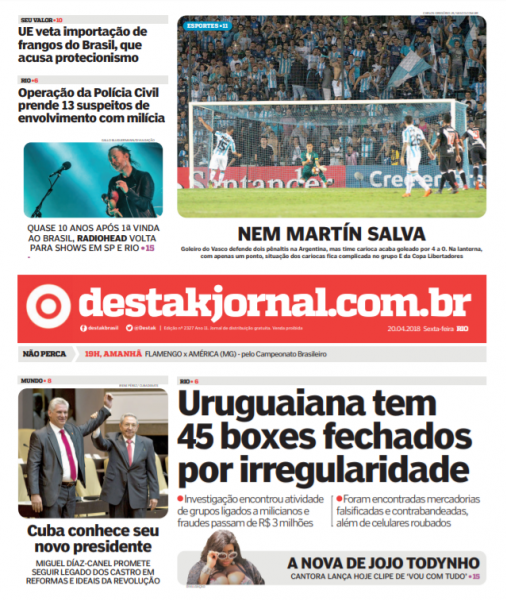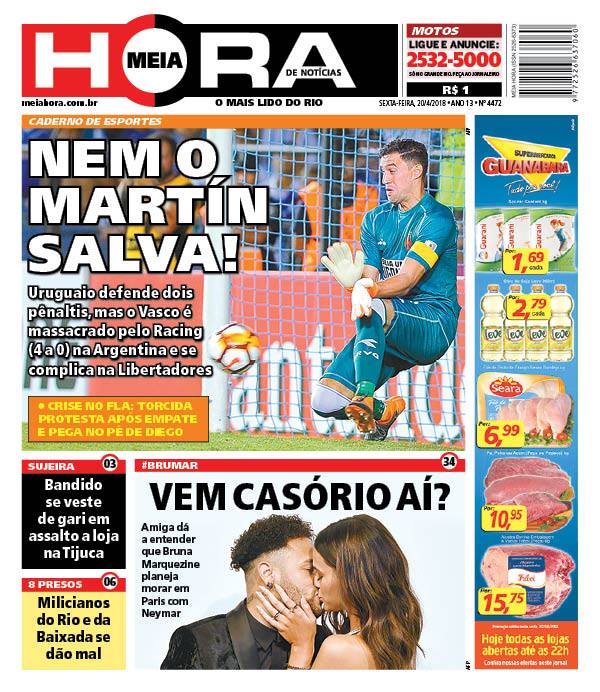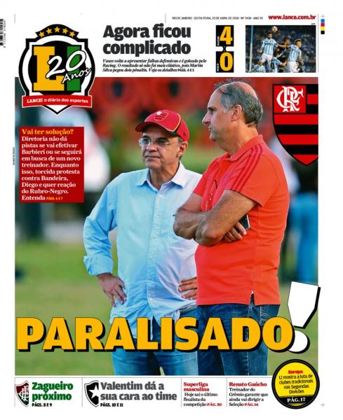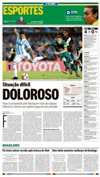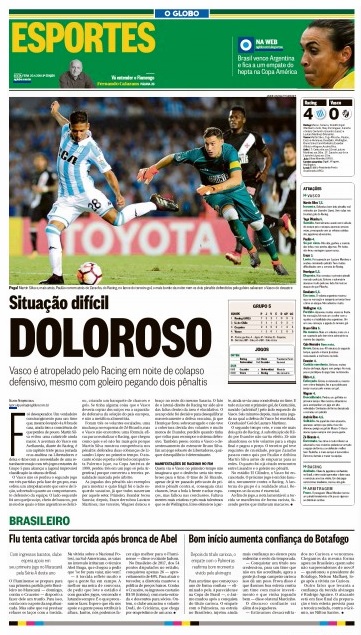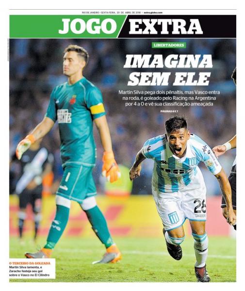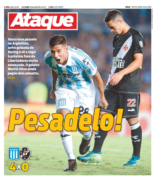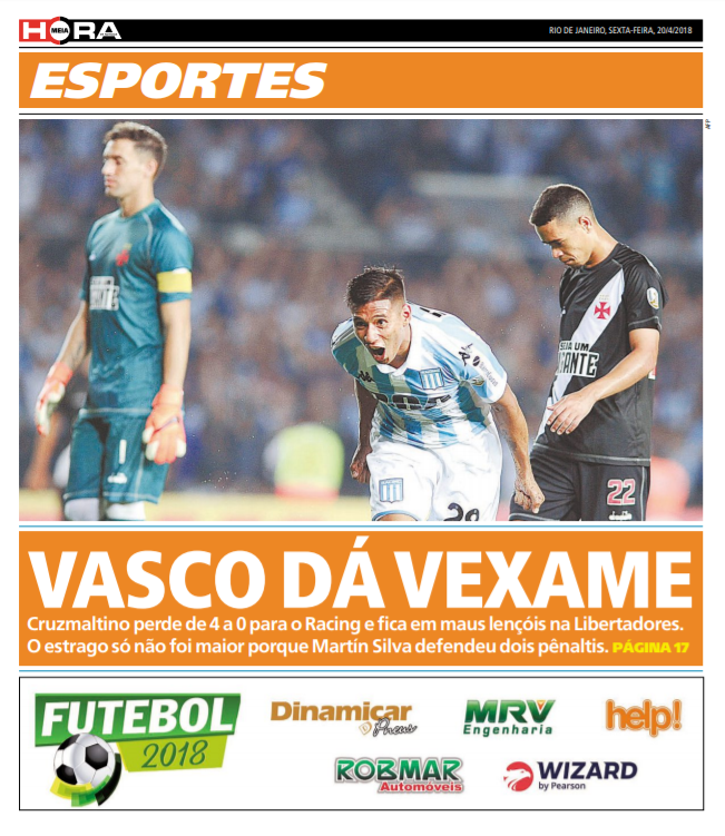 O Vasco foi derrotado pelo Racing por 4 a 0 na última 5ª-feira, na Argentina, pela Libertadores. Veja como a imprensa destacou o mau resultado vascaíno: