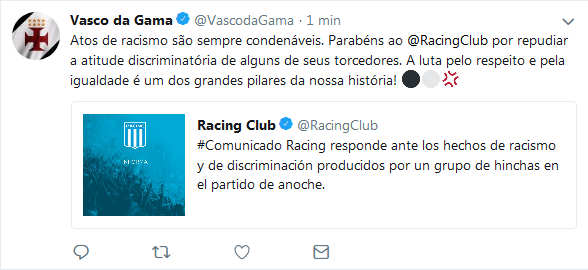 Vasco parabeniza Racing por repudiar ofensas raciais de torcedores durante o jogo desta última 5ª-feira