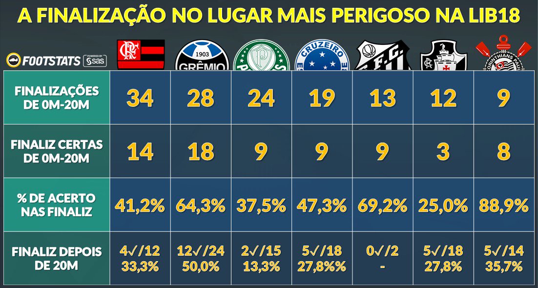 Analisamos as finalizações realizadas pelos times brasileiros na região mais perigosa do campo na Libertadores 18