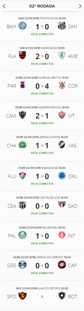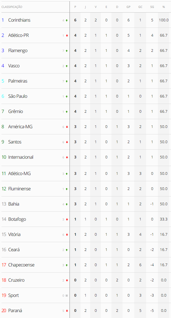 O jogo Sport x Botafogo, nesta 2ª-feira à noite, encerra a 2ª rodada do Brasileiro. O Botafogo só ultrapassará o Vasco na tabela se vencer por 2 ou mais gols de diferença ou por 1 gol de diferença desde que marque 3 ou mais gols; se vencer por 2 a 1, o desempate será feito pelo número de cartões; se vencer por 1 a 0, empatar, ou perder, o Gigante da Colina fechará a rodada em 4º lugar.