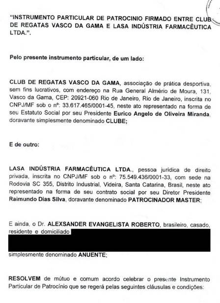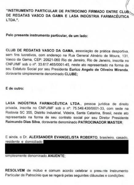 Os opositores buscam nos documentos descobrir o que foi acordado entre as partes. A reportagem do Jogo Extra teve acesso ao contrato assinado por Vasco e Lasa. No papel, consta o ex-gerente científico do clube, Alex Evangelista, anuente do contrato, ou seja, parte que consente com o que foi assinado.