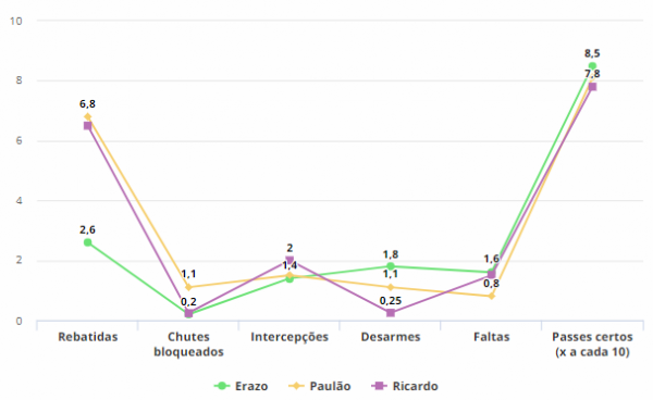 Os números, porém, mostram que o desempenho de Ricardo é parecido com o dos outros dois. Pegando os jogos da Libertadores como recorte (por dados disponíveis e nível comparativo), ele vai bem nas rebatidas e intercepções, mas peca nos desarmes. Veja o gráfico abaixo:
