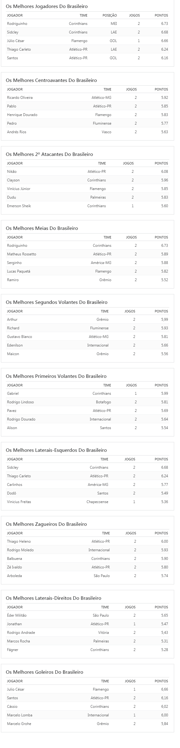 Após a goleada sobre o Paraná, o líder Corinthians colocou, além de Rodriguinho, outros quatro jogadores na seleção do 49º prêmio ESPN Bola de Prata Sportingbet: o lateral-direito Fágner (que deu uma assistência nessa rodada); o volante Gabriel (que marcou o 4º gol do time na vitória sobre o Paraná); o lateral-esquerdo Sidcley (que fez um gol e deu uma assistência e foi o melhor da 2ª rodada); e o segundo atacante Clayson (que também marcou um gol e deu uma assistência).