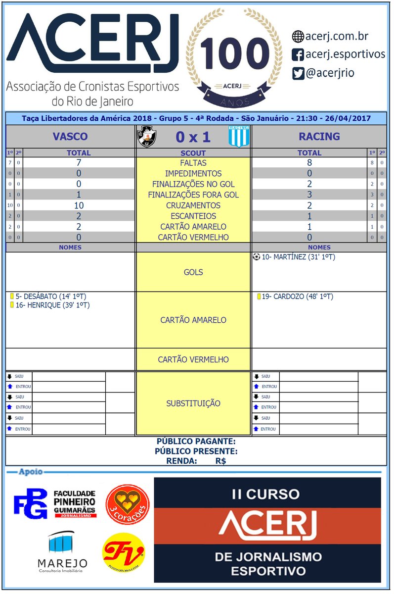 Scout do 1º Tempo de Vasco e Racing pela 4ª Rodada do Grupo 5 da Taça Libertadores da América 2018 #acerjinforma #VASxRAC #ConmebolLibertadores