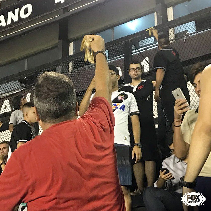 Bastante exaltado, torcedor vascaíno vai à frente da cabine de imprensa acusar a torcida do Racing de atirar cascas de bananas para o lado vascaíno. Na Argentina, alguns torcedores do Racing já tinham imitado macacos em direção aos cruzmaltinos. Assistam: pic.twitter.com/lbrRZhS4jP