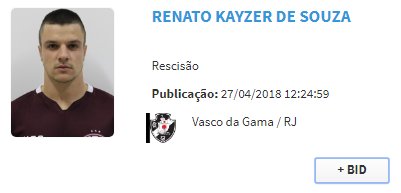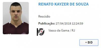 A rescisão de contrato do atacante Renato Kayzer com o Vasco foi publicada nesta sexta-feira no BID da CBF. Ele já treina no Atlético-GO #lanceVAS