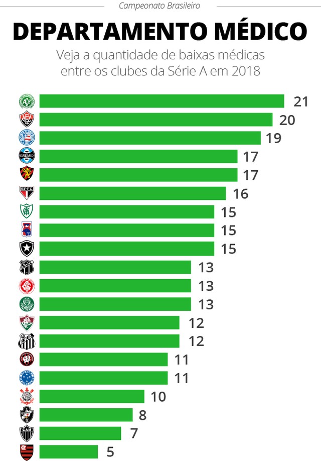 Com a temporada de jogos mais concentrada nos períodos pré e pós-Copa do Mundo, a visita dos jogadores ao departamento médico tende a ser mais frequente em função do aumento de jogos em um período temporal menor que o habitual. Neste quesito, a Chapecoense é quem mais tem sofrido até aqui: já foram 21 baixas clínicas. No time considerado titular, apenas Jandrei, Amaral e Wellington Paulista não se lesionaram neste ano. Além do Verdão do Oeste, o Vitória também tem tido problemas com o DM cheio no ano - são 20 vetos clínicos registrados em 2018.
