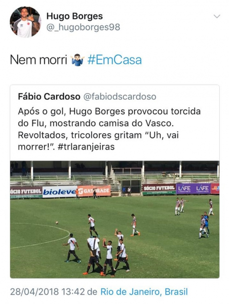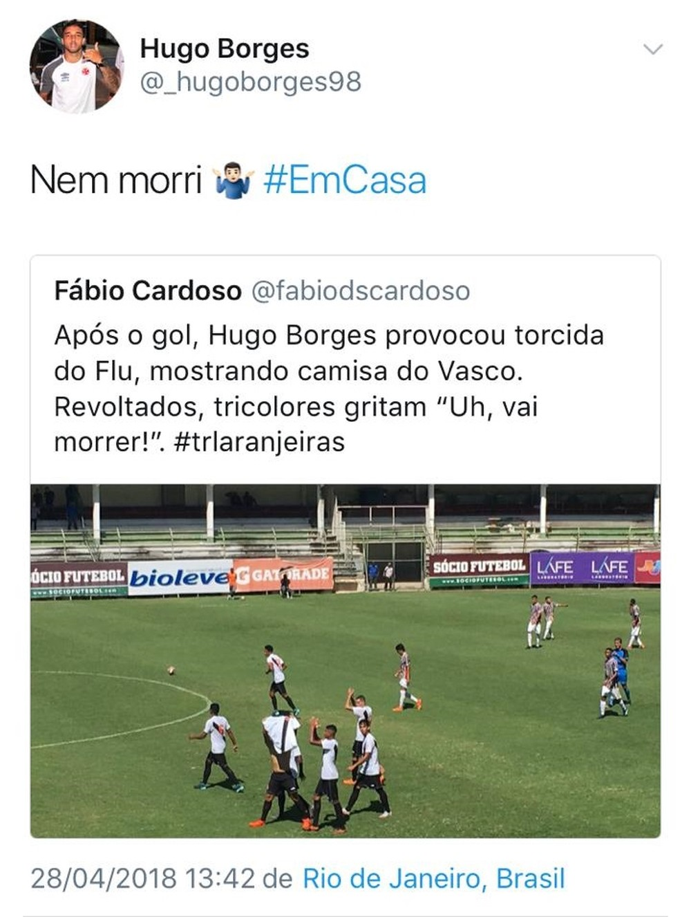 O jogo acabou, mas as alfinetadas continuaram, dessa vez pelo Twitter. Durante a polêmica comemoração, a torcida do Fluminense proferiu gritos de "Uh, vai morrer!" a Hugo Borges, que respondeu de forma irônica na internet. O atacante apagou a mensagem logo depois, mas o registro foi feito. Confira: