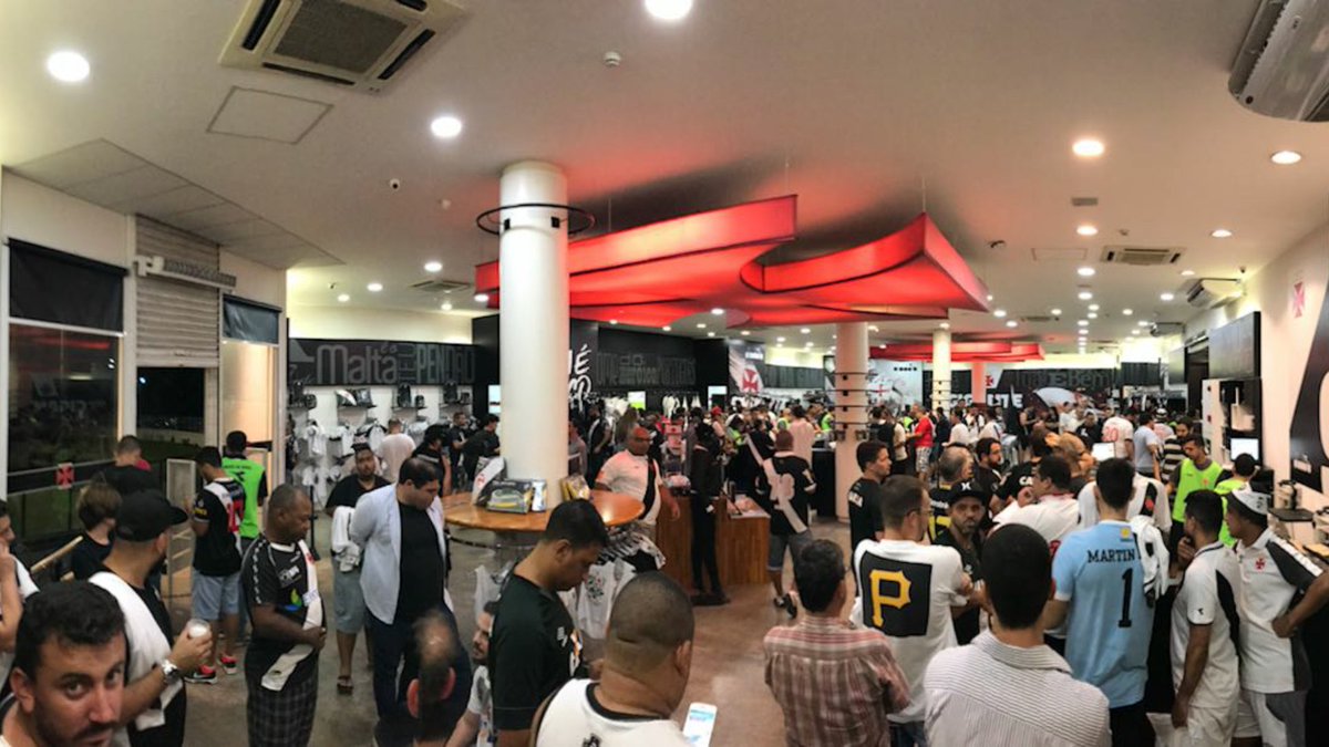 Loja cheia! Com a estreia da camisa nova nesta noite, a torcida compareceu em peso pra adquirir na loja oficial do Vasco em São Januário. Tem até uma saindo agora do volante Leandro Desábato. Fotos tiradas pelo grande Hokage @Casimiro