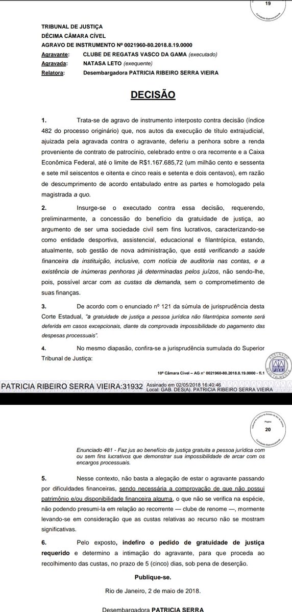 Porém, este acordo foi descumprido agora e juiz determinou penhora de até R$ 1.167.685,72 do contrato do Vasco com a Caixa Econômica Federal. O Vasco recorreu novamente e pediu Assistência Judiciária Gratuita, o que foi negado ontem pela desembargadora Patrícia Pinheiro #lanceVAS