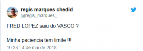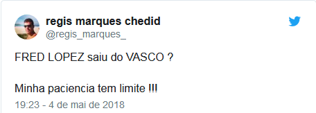 A saída de Fred Lopes da vice-presidência de futebol do Vasco parece não ter agradado Regis Marques, empresário do goleiro Martín Silva. Minutos após ser veiculada a notícia que o dirigente não ficará no clube, o agente se manifestou em sua conta pessoal do Twitter.