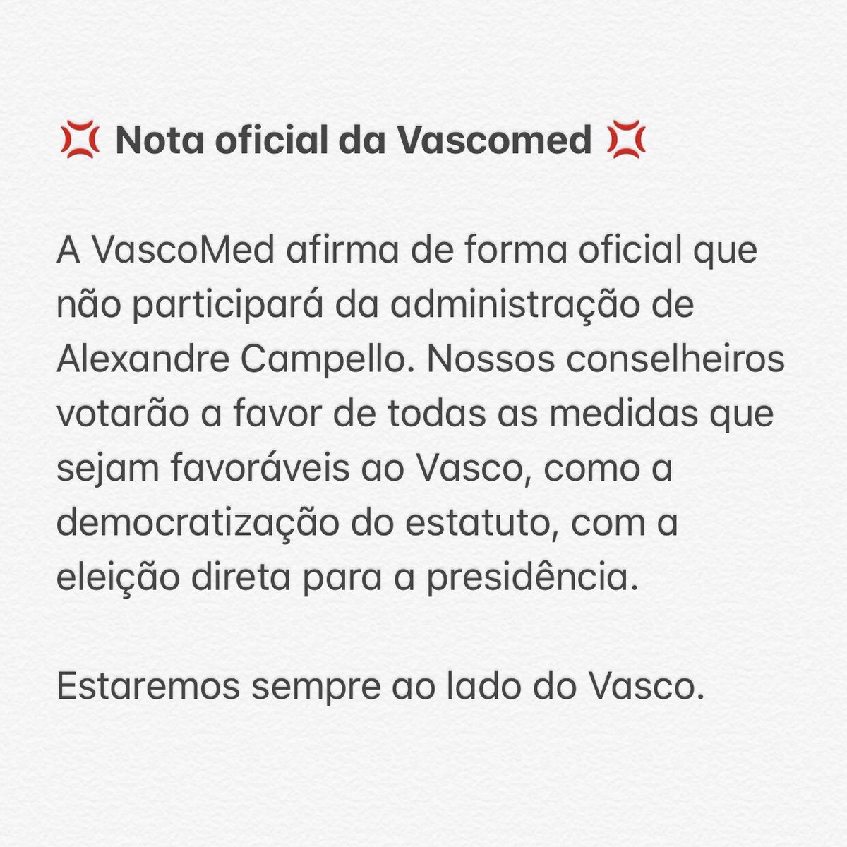 Em nota, VascoMed afirma que não vai participar da administração Campello