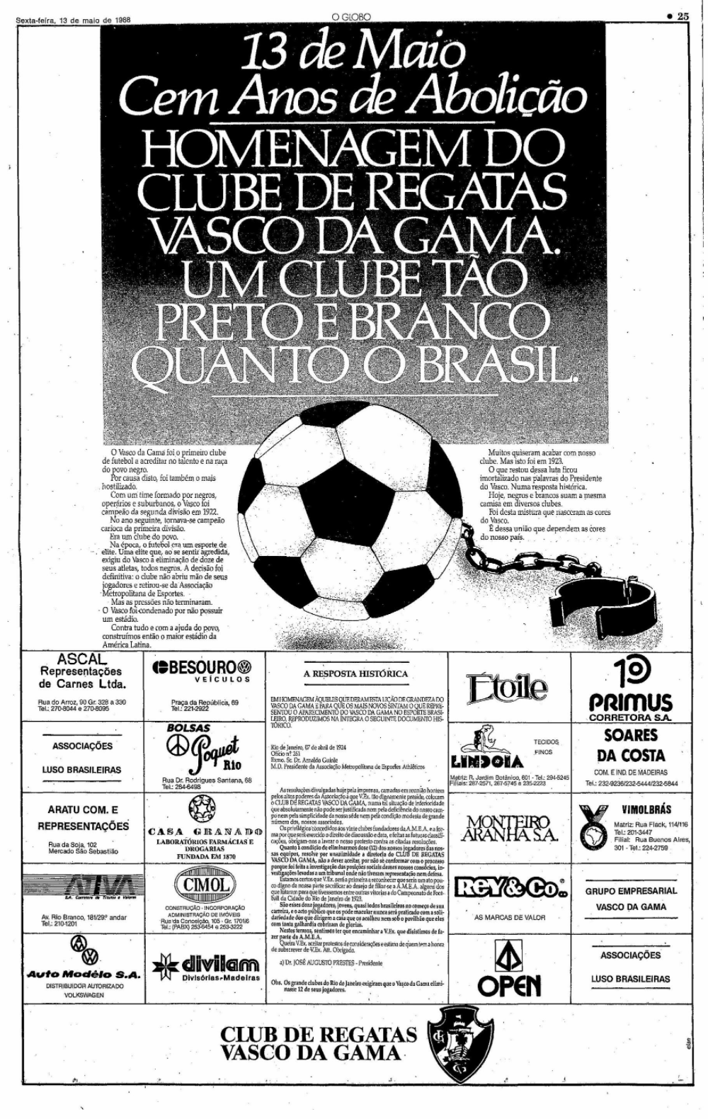 Em 13 de maio de 1988, nos 100 anos desse evento histórico, o Vasco publicou no jornal O Globo um anúncio em que lembrava sua luta pela igualdade racial e social no esporte brasileiro.